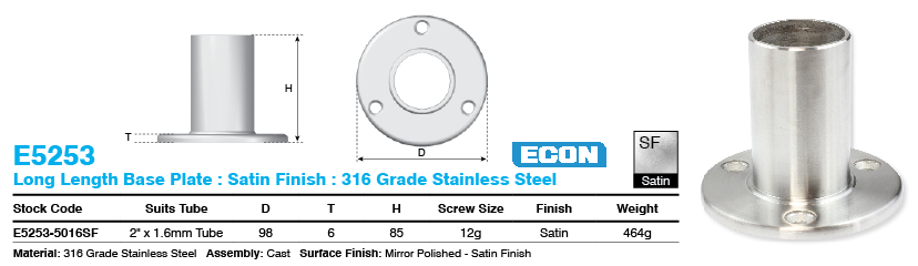 Build your own stainless posts with these economical, solid base plates. Suits 2" stainless steel tube with 1.6mm wall thickness. High quality Satin Finish.