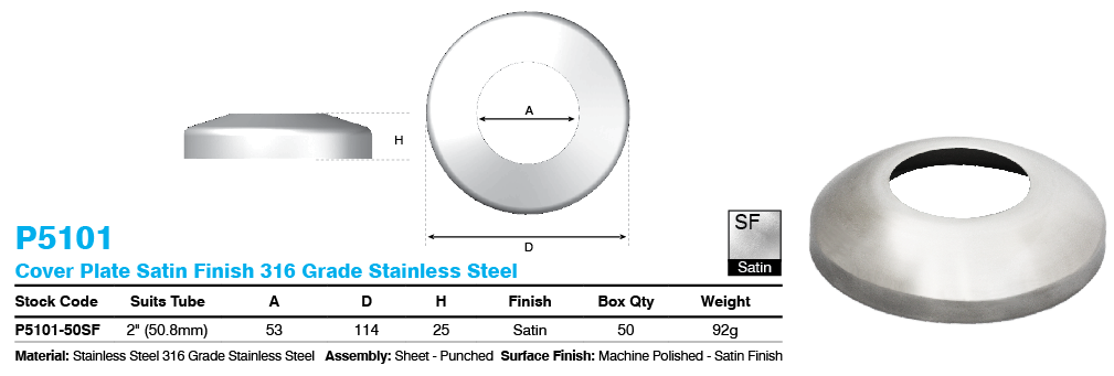 ProRail cover plate in Satin Finish, specially designed for use with ProRail Heavy Duty Base Plates. Beautifully completes 2" posts using the ProRail Heavy Duty Base Plate. Made from high quality stainless steel 316.