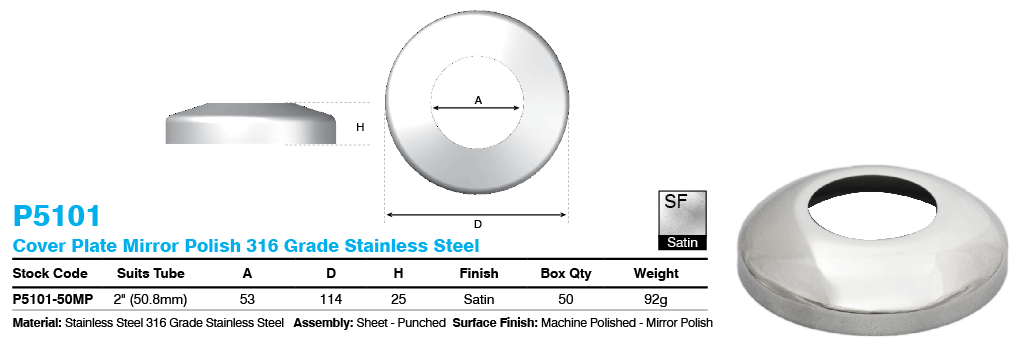 ProRail cover plate in Mirror Polish, specially designed for use with ProRail Heavy Duty Base Plates. Beautifully completes 2" posts using the ProRail Heavy Duty Base Plate. Made from high quality stainless steel 316.