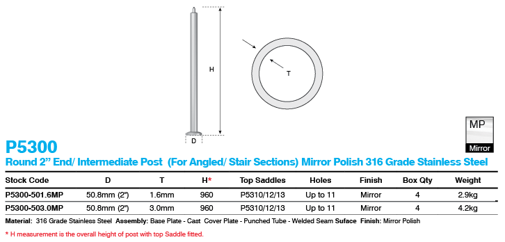 Description / **Special Order** Stainless Round Undrilled Post 2" 1.6mm 960mm Mirror Polish for Angled/Stair Sections