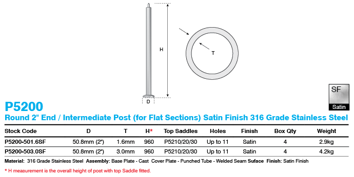 Assembled post and ready for installation (excludes saddle top). Manufactured from high quality 316 Marine Grade Stainless Steel in a Satin finish. Suitable for intermediate, end or corner posts. Standard 960mm height (when a saddle top is attached).