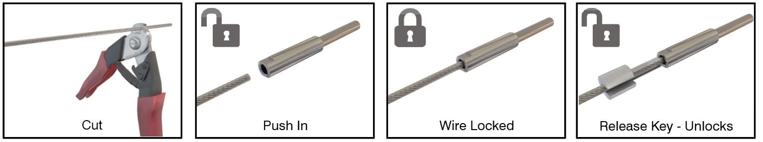 Used in wire balustrdaes, blinds and awnings the Rapid Locks external dimension of only 9mm, its slimline form is compatible with most existing wire guide bottom rail eyes. This slimline system also makes the possibility of lowering the bottom rail to floor level much easier. It can only be used with 3.2mm stainless wire rope. It works most effectively with the 1x19 wire construction.
